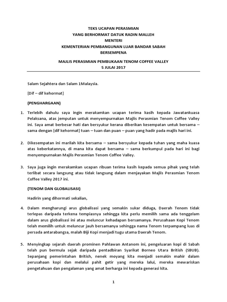 Sekalung penghargaan dan ucapan terima kasih saya ucapkan kepada Bahagian Pengurusan Sumber Manusia Kementerian dan Agensi serta seluruh jawatankuasa yang terlibat menjayakan majlis pada hari ini. Ucapan pihak majlis mengucapkan ribuan terima kasih kepada yang dihormati en kamsano bin padikon atas ucapan itu tadi. Contoh Teks Ucapan Rasmi TEKS UCAPAN Yang Berusaha TnHjMohamad bin HjIkhsan Pengarah Maktab Perguruan Teknik Kuala Lumpur Sempena Majlis Konvokesyen ke-38 Tahun 2005 Pada 25 Febuari 2006 Terima kasih saudara pengacara majlis Bismillahhirahmannirrahim Assalam mualaikum wrt Selamat pagi dan salam sejahtera Yang.
